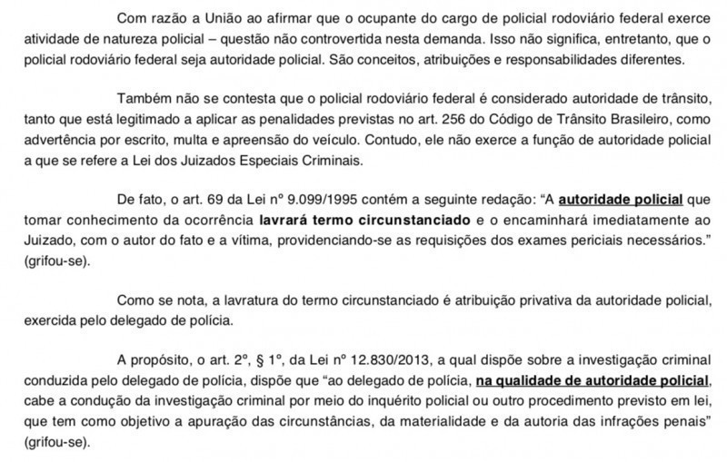 “Essa disposição normativa é inválida”, decidiu Castro. Segundo ele, a Constituição do Brasil determina que apenas a Polícia Federal pode exercer funções de polícia judiciária da União. “Desse modo, não cabe à PRF, de acordo com o texto constitucional, exercer as funções de polícia judiciária da União, a exemplo da realização de investigação criminal, em que se insere a lavratura do termo circunstanciado de ocorrência. Tampouco as leis que regem o tema preveem essa possibilidade.”