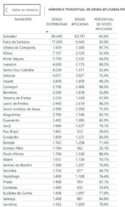 A cidade com melhor percentual, segundo a tabela, é Vitória da Conquista com 97% de doses aplicadas. Veja os números completos abaixo: