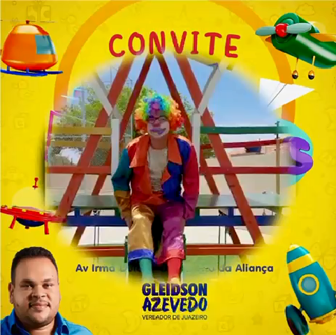 O vereador Gleidson Azevedo (PDT) promoverá uma festa para comemorar o Dia das Crianças. Diversão, alegria e muita animação para as crianças. Com uma super estrutura montada no bairro Alto da Aliança. Vai ter distribuição de presentes, lanches, guloseimas.