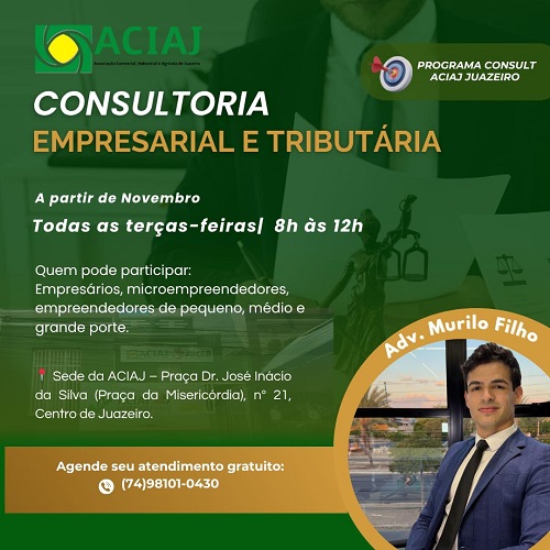 A partir do mês de novembro, empreendedores de Juazeiro passam a contar com consultorias jurídicas, através do Consult Aciaj Juazeiro. A iniciativa da Associação Comercial, Industrial e Agrícola de Juazeiro (Aciaj) tem como objetivo auxiliar os empresários na prevenção de problemas administrativos e por sua vez tributários. Os atendimentos serão realizados todas as terças-feiras, das 8h ao meio-dia, de forma presencial, na sede da Associação, localizada na Praça Dr. José Inácio da Silva, n⁰ 21, conhecida como Praça da Misericórdia, no Centro da cidade.