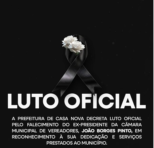 A Prefeitura de Casa Nova lamenta profundamente o falecimento de João Borges Pinto, ex-vereador, ex-presidente da Câmara Municipal e pai do atual presidente da Casa Legislativa. Reconhecido por sua trajetória de dedicação à vida pública e pelos relevantes serviços prestados ao município, João Borges Pinto deixa um legado de compromisso e respeito à comunidade casanovense.