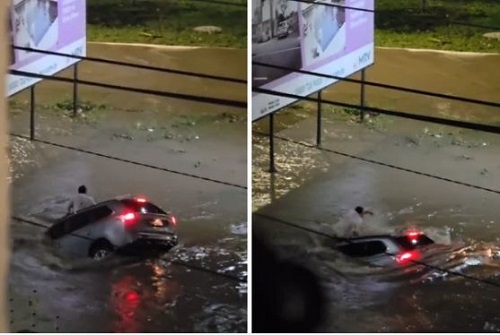 Em um vídeo, o homem aparece em cima do teto do carro, em meio a um alagamento. O veículo, no entanto é sugado e, segundos depois, o homem também desaparece.
