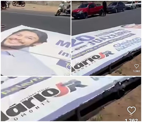 A placa de outdoor, que continha publicidade de políticos, ficou estendida no meio da pista.