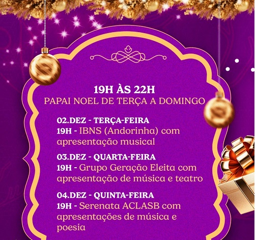 A Prefeitura de Senhor do Bonfim preparou uma programação cultural especial para o Natal Iluminado desta semana, no palco da Praça Nova do Congresso. De terça a quinta-feira, além das atrações musicais e teatrais, o público poderá aproveitar, das 19h às 22h, a presença do Papai Noel, que estará no espaço para fotos e interação com as famílias.