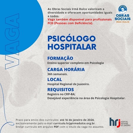 O Hospital Regional de Juazeiro (HRJ), administrado palas Obras Sociais Irmã Dulce (OSID), abriu nesta segunda-feira (12), o processo seletivo para os cargos psicólogo hospitalar e fisioterapeuta. Os interessados devem enviar o currículo anexado em formato PDF através do endereço de e-mail curriculo.hrj@irmadulce.org.br, até o dia 16 de janeiro (sexta-feira). No assunto do e-mail, deve ser informado o nome da vaga que deseja concorrer.