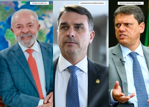 Numa disputa incluindo Tarcísio, Flávio Bolsonaro segue em segundo lugar. Lula teria 36%, Flávio Bolsonaro, 23%, e Tarcísio, 9%.