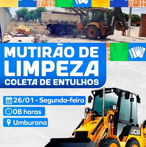 A Prefeitura de Senhor do Bonfim, por meio da Secretaria Municipal de Infraestrutura e Meio Ambiente, realiza nesta segunda-feira (26) o Mutirão de Limpeza com coleta de entulhos no povoado de Umburana, localizado no interior do município. A ação integra as iniciativas contínuas da gestão voltadas ao cuidado com os espaços públicos, à promoção da saúde e à melhoria da qualidade de vida da população.