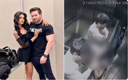 Um empresário de 35 anos foi flagrado agredindo a namorada, de 23, dentro de um elevador. No vídeo, a mulher é enforcada até desmaiar e, em seguida, arrastada para fora do elevador. Eles foram identificados como Alcides Bortoli Antunes e a influenciadora digital Nayara da Conceição Brito.