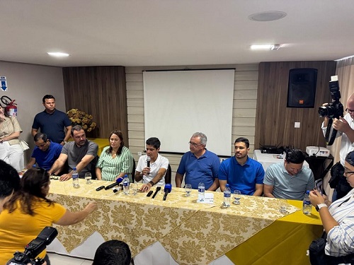 O ex-prefeito de Salvador e pré-candidato ao governo da Bahia, ACM Neto, acompanhado de lideranças do seu campo político a nível local e estadual, a exemplo do prefeito de Salvador, Bruno Reis; do pré-candida6to ao senado, João Roma; do deputado federal, Adolfo Viana; da ex-prefeita de Juazeiro, Suzana Ramos e do ex-prefeito Isaac Carvalho, concedeu entrevista coletiva nesta sexta-feira (30), no Rapport Hotel, em Juazeiro.