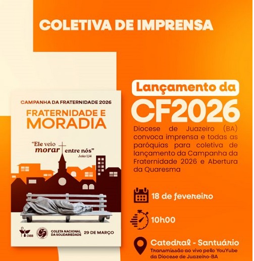 A Diocese de Juazeiro promoverá no dia 18 de fevereiro, às 10h, uma coletiva de imprensa para o lançamento oficial da Campanha da Fraternidade 2026 e Abertura da Quaresma.