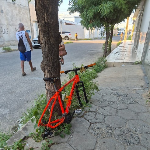 Um furto inusitado chamou a atenção de moradores na tarde desta segunda-feira (27), em Juazeiro. Um ladrão roubou os pneus de uma bicicleta que estava presa a uma árvore, em plena luz do dia, na Travessa Paulo VI, localizada nos fundos da Faculdade de Tecnologia e Ciências (FTC), nas proximidades do Shopping Águas Center.