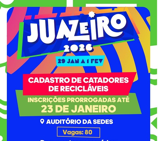 A Prefeitura de Juazeiro, por meio da Secretaria de Desenvolvimento Social, Diversidade, Igualdade Racial e Combate à Fome (Sedes), prorrogou até sexta-feira (23) o prazo de inscrições para o cadastro de catadores e catadoras de materiais recicláveis que irão atuar durante o Carnaval de Juazeiro 2026, que acontece entre os dias 29 de janeiro e