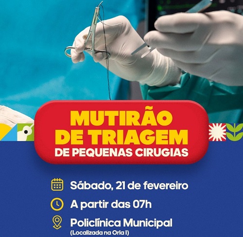 A Prefeitura de Juazeiro, por meio da Secretaria Municipal de Saúde (Sesau) promove, neste sábado (21), um mutirão de triagem para pequenas cirurgias. A ação acontecerá a partir das 7h, na Policlínica Municipal, localizada na Orla I da cidade, e tem como objetivo ampliar o acesso da população aos procedimentos de baixa complexidade. O mutirão