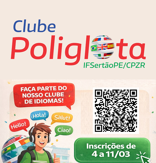 O campus Petrolina Zona Rural do IFSertãoPE está com inscrições abertas, até dia 11 de março, para o Clube Poliglota, projeto de extensão com objetivo de oportunizar a prática de conversação em inglês, espanhol e/ou francês, ampliando a habilidade de comunicação nesses idiomas. As inscrições são gratuitas e podem ser feitas através de preenchimento de formulário