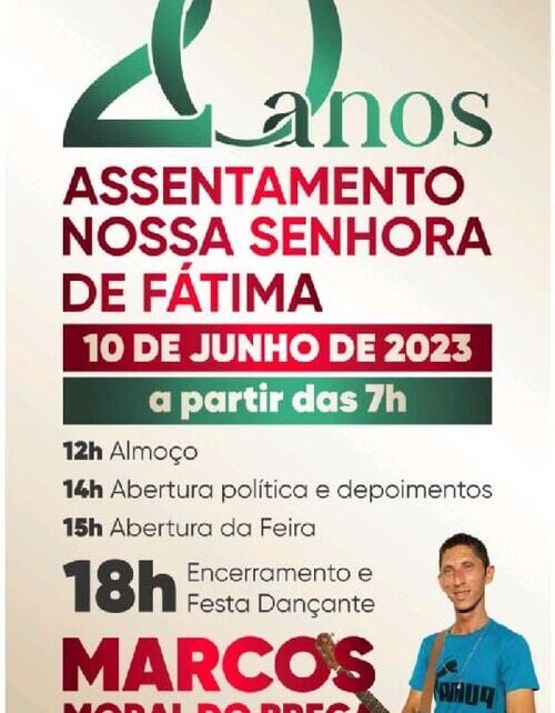 Nos 20 anos de existência, o Assentamento Nossa Senhora de Fátima dará pontapé inicial a Feira de Animais para comercialização de caprinos, ovinos, suínos, bovinos, todos criados no assentamento, bem como, a venda de suas produções locais, como artesanato, frutas e hortaliças. A primeira feira acontecerá dia 10 de junho com abertura programada para acontecer