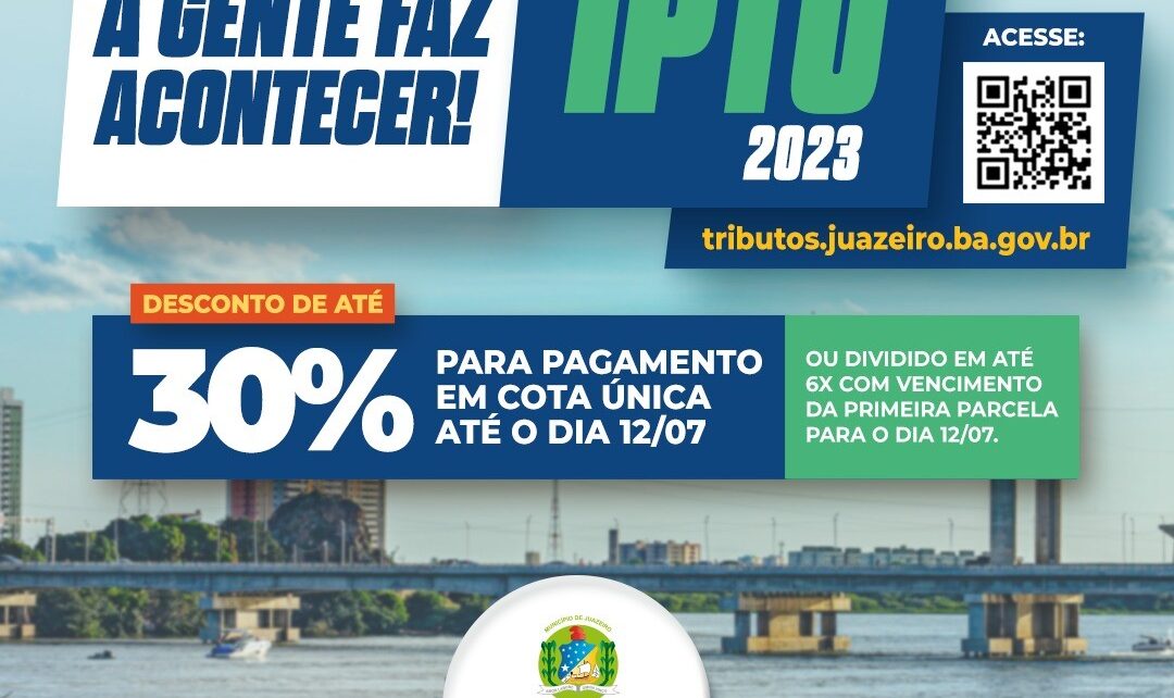 A Prefeitura de Juazeiro, através da Secretaria da Fazenda (SEFAZ), informa que o Imposto Predial e Territorial Urbano (IPTU) referente ao exercício de 2023 pode ser pago em cota única ou parcelado em até seis vezes. O vencimento da cota única ou da primeira parcela ocorre no dia 12 de julho. Os contribuintes que optarem