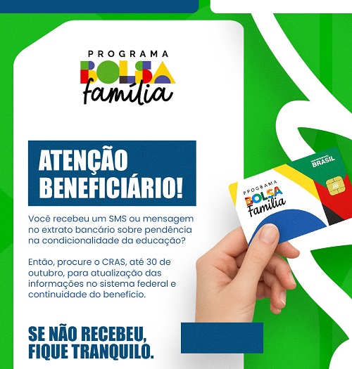 A Prefeitura de Casa Nova, por meio da Secretaria de Desenvolvimento Social, Igualdade e Combate à Fome, alerta os beneficiários do Programa Bolsa Família que receberam notificação do Governo Federal sobre pendências nas condicionalidades da educação. Os beneficiários devem procurar o Centro de Referência de Assistência Social (CRAS) até o dia 30 de outubro para