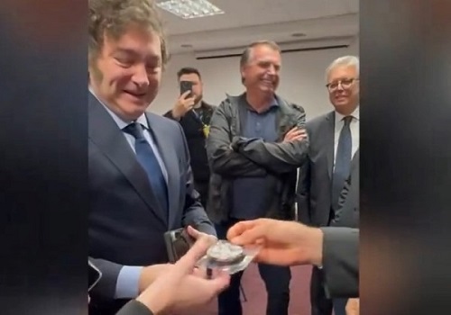 Jair Bolsonaro (PL) deu uma medalha para o presidente da Argentina, Javier Milei, com três “Is”, de imbrochável, imorrível e incomível. Segundo pessoas que estavam no encontro, Milei o agradece, de acordo com o jornal O Globo. A cena foi registrada em vídeo por Eduardo Bolsonaro. O ex-presidente costuma entregar o objeto como presente para