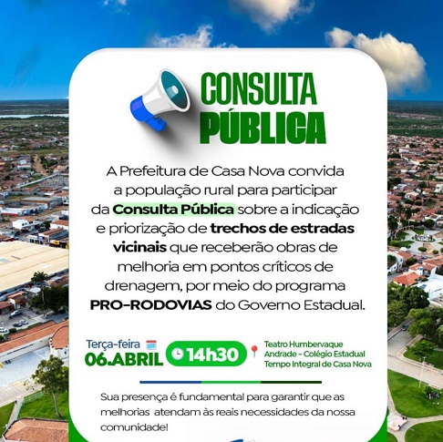 A Prefeitura de Casa Nova realiza, nesta terça-feira (06), uma importante Consulta Pública voltada à população rural do município. O encontro, que vai acontecer, às 14h30, no Teatro Humbervaque Andrade, no Colégio Estadual de Tempo Integral, tem como objetivo ouvir os moradores sobre a indicação e priorização de trechos de estradas vicinais que receberão obras