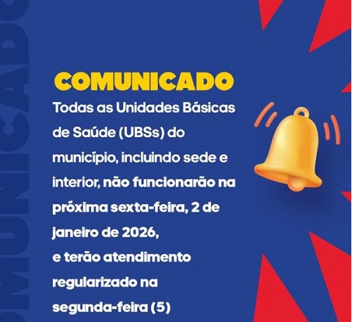 A Secretaria Municipal de Saúde de Juazeiro (Sesau) informa que, na próxima sexta-feira, 2 de janeiro de 2026, todas as Unidades Básicas de Saúde (UBSs) do município tanto da zona urbana quanto da zona rural, não terão funcionamento. A suspensão temporária ocorre em razão do processo de transição para o novo modelo de cogestão com