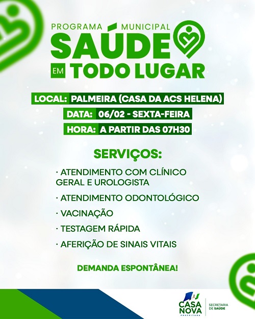 A Prefeitura de Casa Nova, por meio da Secretaria Municipal de Saúde, realiza no dia 06 de fevereiro a primeira edição do ano do Programa Saúde em Todo Lugar, que desta vez contemplará a comunidade de Palmeira, no interior do município. A ação acontece a partir das 7h30, na casa da ACS Helena, com atendimento […]