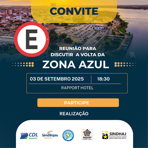 Será realizada nesta quarta-feira (3), às 18h30, uma reunião para debater o retorno da Zona Azul em Juazeiro. O encontro, que acontecerá no Rapport Hotel, tem como objetivo buscar o formato mais eficiente para o sistema de estacionamento rotativo, de modo a reduzir os impactos negativos tanto para comerciantes, comerciários quanto para clientes. A iniciativa