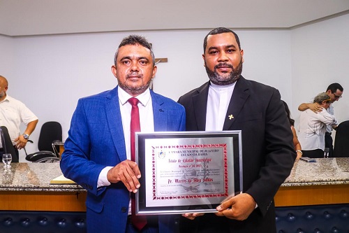 A Câmara Municipal de Juazeiro realizou, na noite desta segunda-feira (20), uma Sessão Solene para a concessão do Título de Cidadão Juazeirense ao Reverendo Padre Marcos da Silva Santos. A homenagem, de autoria do vereador Mitu, representa o mais alto reconhecimento do Poder Legislativo Municipal e foi concedida em justo agradecimento pelos relevantes serviços prestados